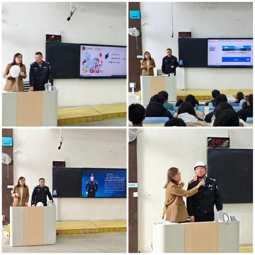 本次安全教育紧扣留学生高频安全风险,围绕交通法规、证件管理、禁毒宣传、电信诈骗防范等核心内容展开。驻校民警李金鹏通过留学生频发的真实治安案件进行以案说法;交警李玉强重点讲解中国交通法规,着重强调电动车骑行规则和注意事项,并现场演示头盔正确佩戴方法;出入境管理支队警官赵东哲重点强调了护照变更、签证延期、住宿登记的时效性,以及非法打工的危害性。郭艳秋结合日常管理,对新生们进行了禁毒教育和电信诈骗科普。本次安全教育采用“政策解读+案例警示+互动答疑”模式,内容实用、针对性强。
